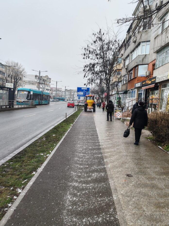 Având în vedere că se mențin condițiile de depunere a poleiului, se intervine inclusiv în cartiere, pe trotuare, în stațiile de autobuz și la trecerile de pietoni. Acțiunile vor continua atât pe timpul zilei, cât și pe timpul nopții”, informează Primăria municipiului Galați.