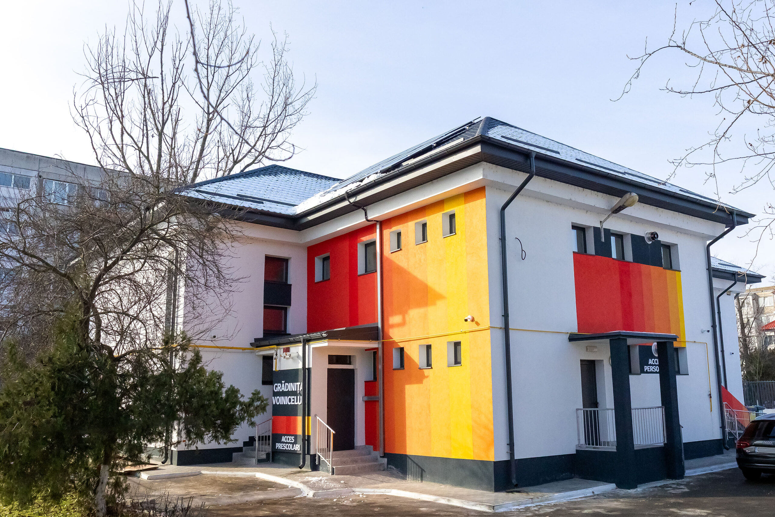 De asemenea, au fost realizate o rampă pentru persoanele cu dizabilități și o scară metalică exterioară pentru evacuare, a fost refăcută împrejmuirea, au fost amenajate locul de joacă și spațiul verde și a fost instalat un sistem automat de irigații.