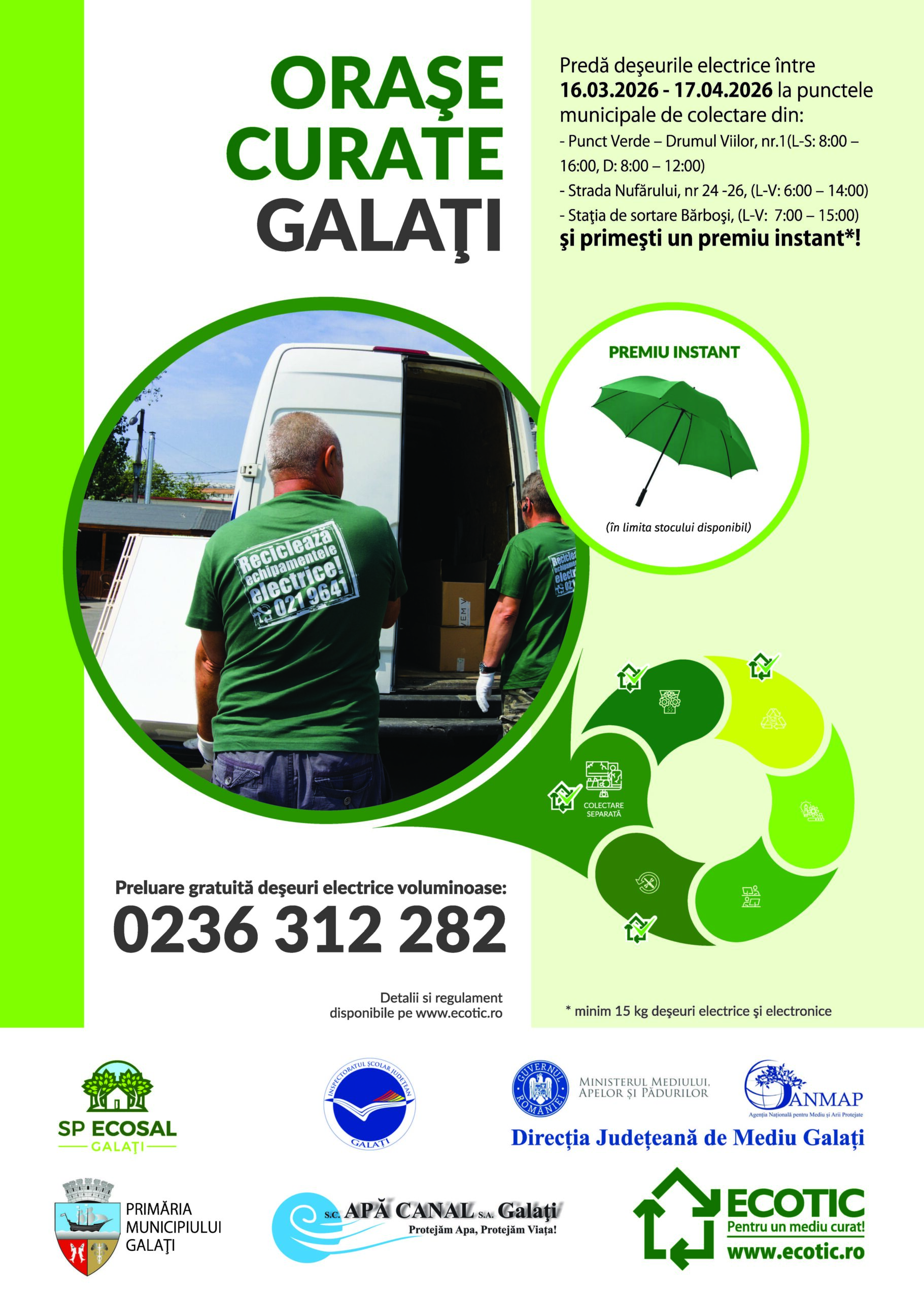 Serviciul Public Ecosal, în parteneriat cu Asociația Ecotic, desfășoară, până pe data de 17.04.2026, campania de informare și colectare echipamente electrice, electronice și electrocasnice (DEEE) “Orașe Curate – Galați”.